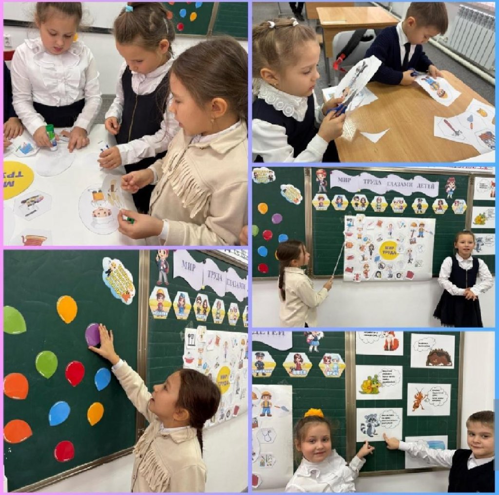 Мақсаты: шығармашылық қызмет арқылы мамандықтармен танысу. Сабақтың басында Еңбек және кәсіптер туралы әңгіме өткізілді. Содан кейін оқушылар шығармашылық жұмысқа кірісті. Барлығы тапсырманы орындады, жұмыстар әртүрлі болды, балалардың Еңбек идеясын көрсетті. Балалар қызығушылық, белсенділік және дербестік танытты. Өткізілген сабақ оқушылардың шығармашылық қабілеттерін дамытуға, олардың ой-өрісін кеңейтуге және еңбекке оң көзқарасты қалыптастыруға ықпал етті.